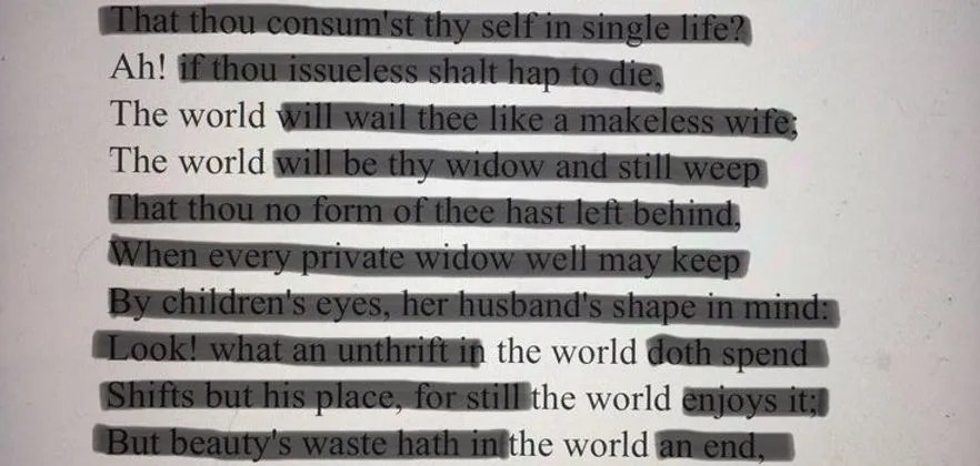 Writing for exercise, you lose two if you wish. One should yield confidence building results. She can. Your ideal reflects your definition, as oblique as you know yourself. You do have something strange, some ownership you depend upon. Your erasure in the source material. Exercise some, go far, if you wish. An “ED” to change (it’s a small cheat, but permissible here). Appear in the same method, deleting it again like always. You choose white spaces, erased, conventional, invisible. Exercise is required, it’s complicated, don’t worry. Wave to facilitate erasure. Please consider exercise, at least some brief poetical voyage to try erasing metaphor. You create metaphors of oil, everyday’s menu, we can tell. Exercise may be useful, not just a neglected plant on your kitchen sill. Reveal the light. Evoke a response. You wish things are as honest as what you have seen. Exercise, though you need not love your feelings. Sheen, and heft, they will now resemble a person, another object or body. Suggest something about the “real” subject, nowhere should that subject be named. I failed to avoid personification, just a person plausibly revealing your forgeries. Choose you, be strong. You are permitted to fool me regarding the original. You appear awkward, choose end-words if you wish to be a little more liberal. Be careful not to carry this too far, it begins to feel dishonest. Your refrain must be interesting, this is a story. You need not keep the same length. Choose your borrowed lines carefully. Don’t forget exercise.
