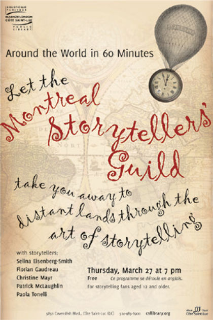 The Montreal Storytellers Guild is the largest English storytelling group in Montreal, and they host story-swaps at the Westmount Library on every second Thursday of the month. These evenings are open to all interested in listening to stories, learning about the nuances of performance, or divulging their own favourite tales—both true and tall. But the Guild’s events extend far beyond their monthly storytelling swaps: the Guild has remained deeply involved with Montreal’s storytelling community for years while sponsoring a number of events and workshops at schools and colleges across the city.
