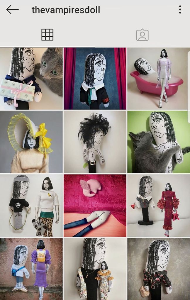 Susie Cave, Nick Cave’s wife, is the creator and curator of the account. She plays with the text of the vocalist of The Bad Seeds and use it to contextualize a tale of two dolls and a cat. For instance, in the installment from October 13, 2018, the characters, a pair of soft dolls with a cartoonish version of Nick and Susie printed on respectively (Nick doll is the only one available for sale) stand close to each other against a white wall, wearing elaborate dark blue velvet. outfits. By Nick doll’s shiny shoes, we see a big yellow flower peeking through a matching visiting bag. “When I get home, I’m gunna unpack my bags” (Nick Cave & The Bad Seeds, Right Now I’m A-Roaming), reads the caption. In the surface scene plays with the normalized idea of romance. Nick doll cherishes Susie doll with a flower. But the flower is there to mislead. If you are familiar with the full song, you know that the minute he finishes to unpack, he is going to pack again and leave. The pass to join a community, a selective community, Nick’s community, is in the inside joke hidden in the post.