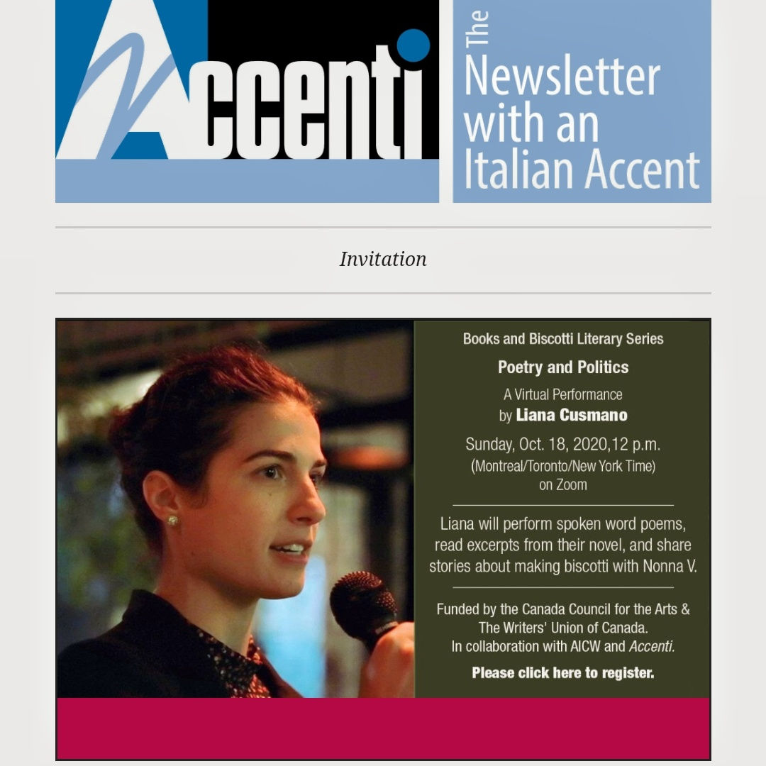 An Italian family Sunday lunch is the setting of one of the first poems Montreal poet, Liana Cusmano (they/them), read on the virtual performance “Poetry & Politics” that Accenti magazine organized on October 18th. At noon as people began to come into the call, their kitchens, offices, and living rooms appeared on my screen, creating an atmosphere of intimacy and trust which is ideal for a poetry reading regardless of the medium.
