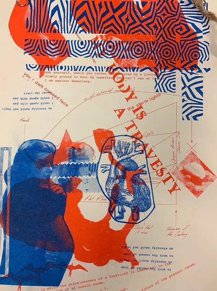 Some of the equipment at the CEP includes: A 3D printer and laser cutter, computers with the latest design software, a library focused on 20th and 21st centuries experimental poetry, a projector and a conference room. But their risograph caught my attention as particularly important, serving for small press printing. Jess, the lead risograph printer, let me have a peek at their appealing collage collection and other prints from their archive.