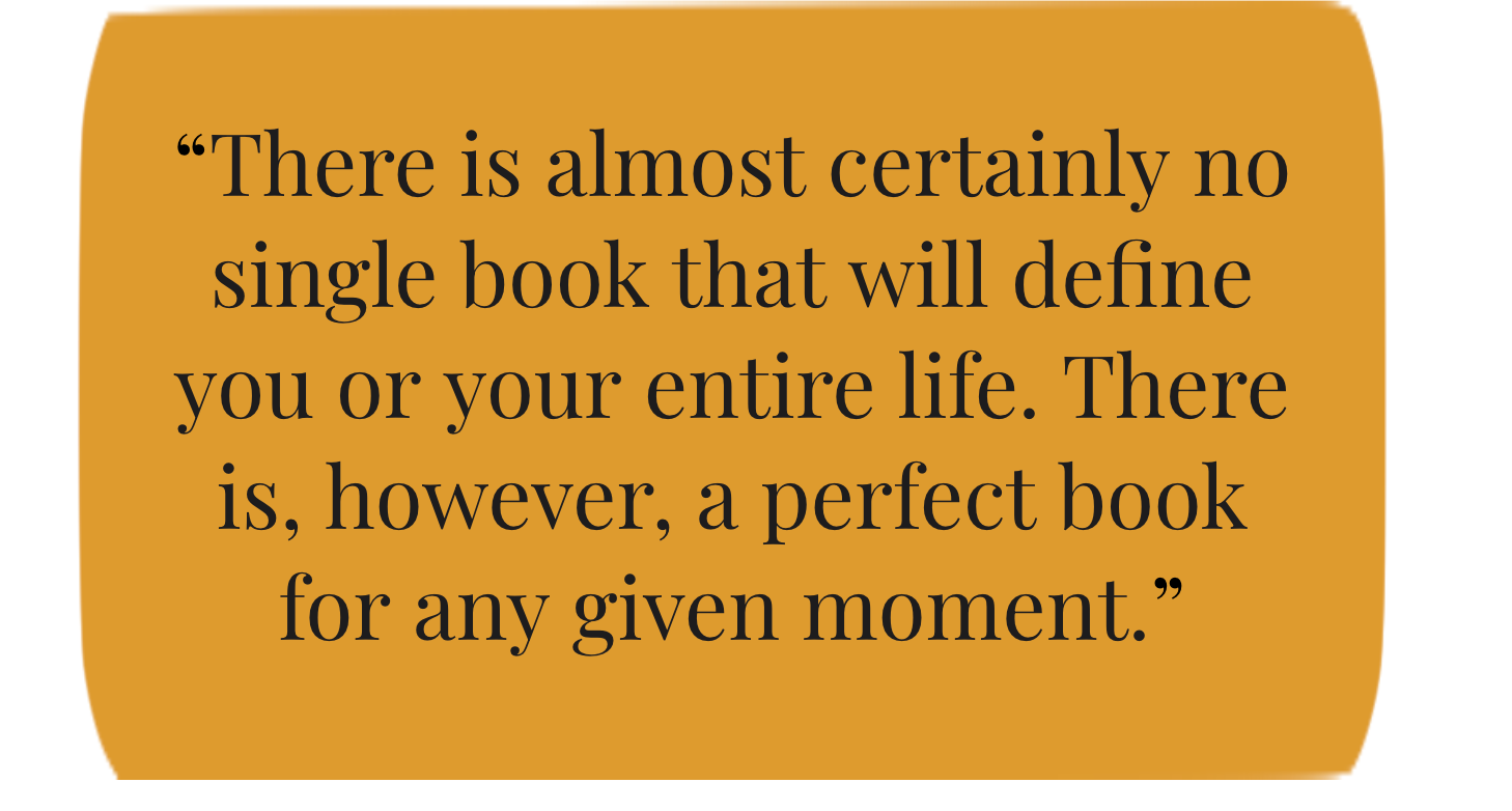 That appellation may be misleading. There is almost certainly no single book that will define you or your entire life. There is, however, a perfect book for any given moment. Often you don’t have it, merely reading occasionally as you go through your days, but you know when you do. When you’ve picked up a book and suddenly it consumes your hours, makes your mind soar with its ideas, and makes your heart race with its artfulness.
