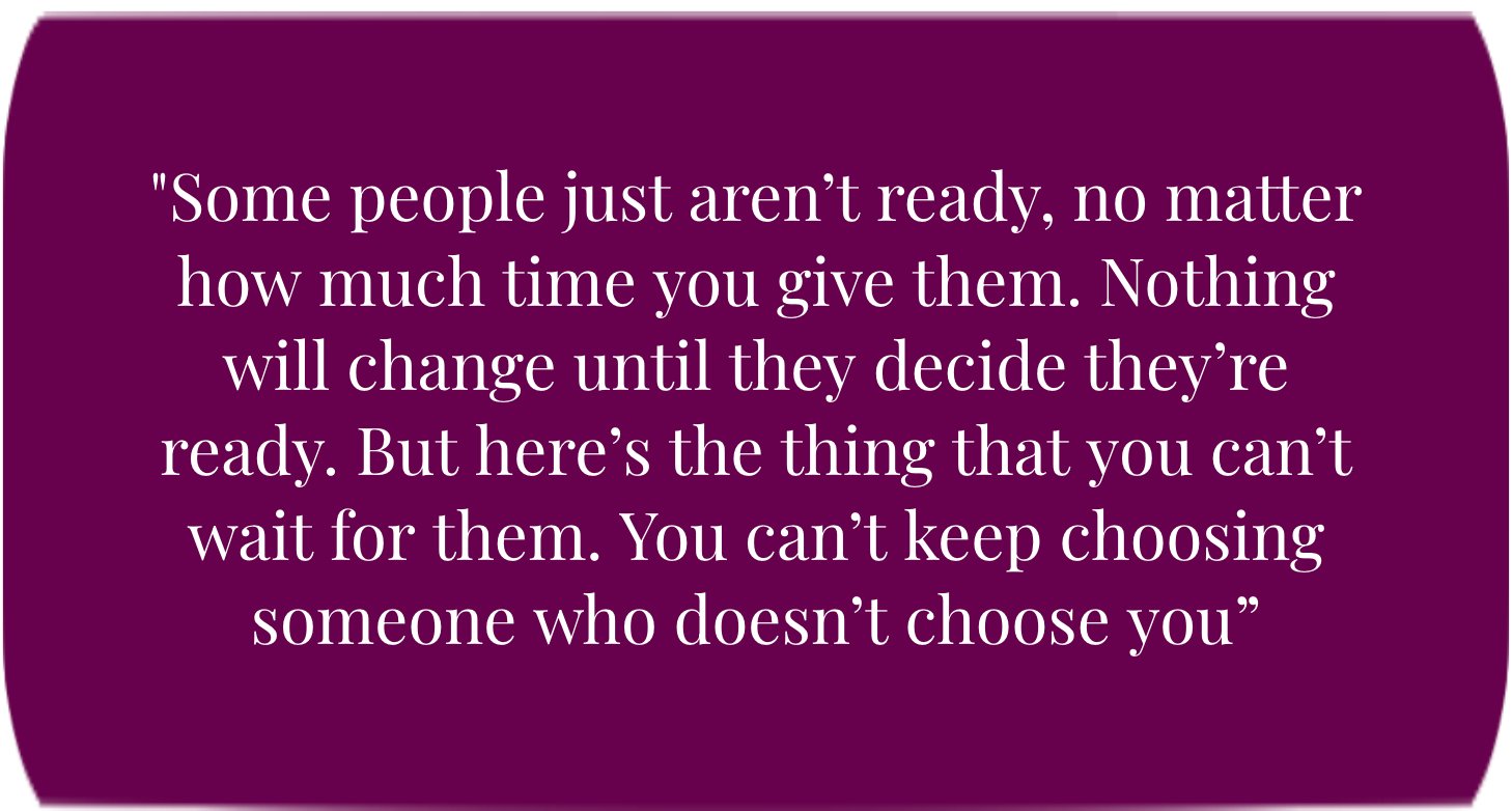 I often intellectualize my feelings and let them fade out until I convince myself that I’ve overthought the situation or I’m being too dramatic. But what if I let go of him and started to hold on to my family, my friends, my accomplishments, myself? Well, I would make space for a man who appreciates and loves every part of me inside and out. I would make space for myself, not to grow but to go back to the girl who loves so deeply and with every part of her soul. A girl who sees the best in everyone unless she’s given a reason not to, a girl who oozes sunshine because she’s so completely in love with herself. A girl who wouldn’t spend hours wondering why he didn’t text or call her back or wondering why she’s not good enough, what should she have done differently. Because “Some people just aren’t ready, no matter how much time you give them. Nothing will change until they decide they’re ready. But here’s the thing, that you can’t wait for them. You can’t keep choosing someone who doesn’t choose you” (102).