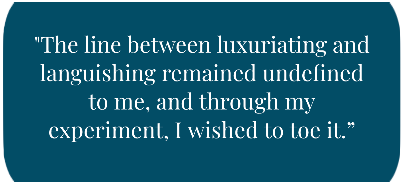 In many ways, I already practice my own regimen of slowness. I rarely use my phone in public. I frequently choose the bus over the metro, no matter the travel time, in order to gaze out the window at the city whose splendor to this day has not ceased to overwhelm my nerves. Coincidentally, I even eat and drink slowly, physically unable to chew any faster. However, these practices are already deep-set and require no thought or energy. What I sought was a derangement of the senses, of my established order. I sought awareness of every minute. The line between luxuriating and languishing remained undefined to me, and through my experiment, I wished to toe it.