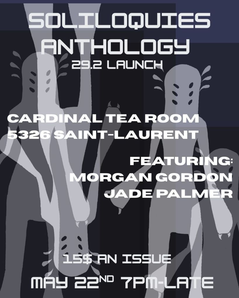29.2 LAUNCH MAY 22ND: Celebrate the launch of issue 29.2 of Soliloquies Anthology at Cardinal Tea Room on May 22nd, 7 – Late.