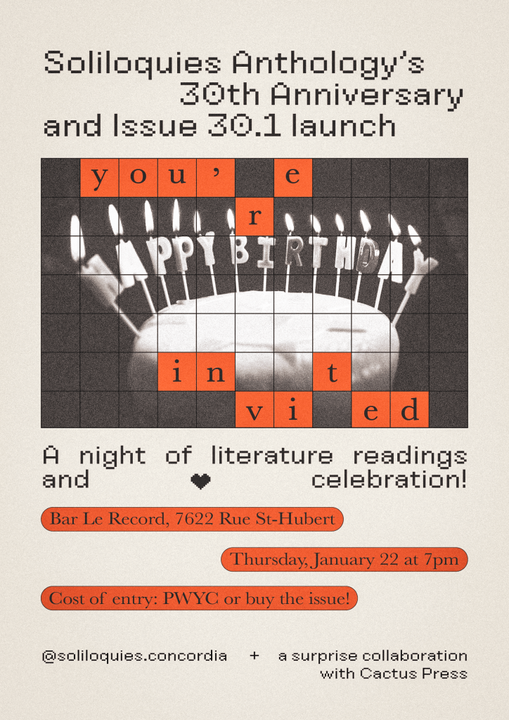 Join us at Bar Le Record for the launch of Edition 30.1, as well as Soliloquies Anthology’s 30th birthday! We have an exciting night of readings planned, along with a special surprise collaboration with Cactus Press (The launch of their 20th anniversary edition lit scene crossword, linked here: https://devongallant.wixsite.com/cactuspresspoetry/crossword ). Grab a drink, pick up a copy, and enjoy the incredible literature that we have the privilege of putting into print!